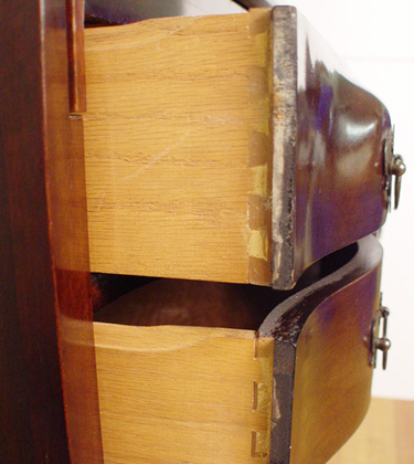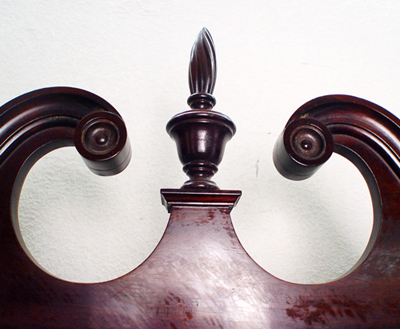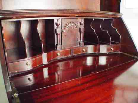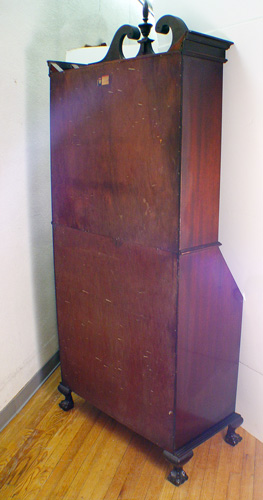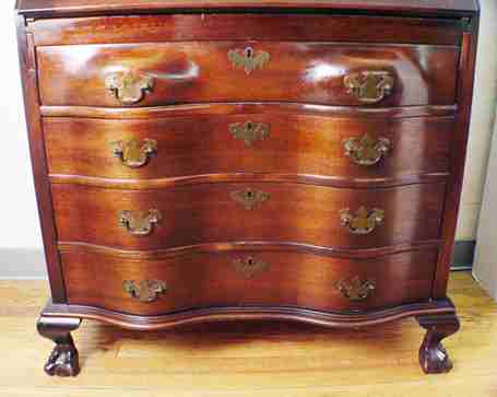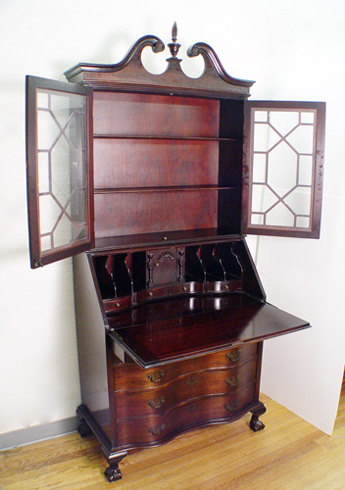FINE MADDOX MAHOGANY SECRETARY DESK: Featuring spiral carved finial, glass front doors on the bookcase, slant front desk over 4 serpentine front drawers, ball and claw feet. 83''h. x 36'' x 19''.