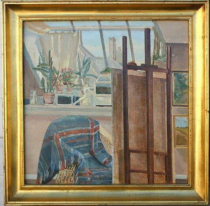 PARSLEV, Einar, (Danish,1891-): Artist's studio, O/B, 29 1/2'' x 29 1/2'', signed bottom margin, dated 1921, exhibition labels from 1928 and 1938 verso, worn frame, 36'' x 36''.