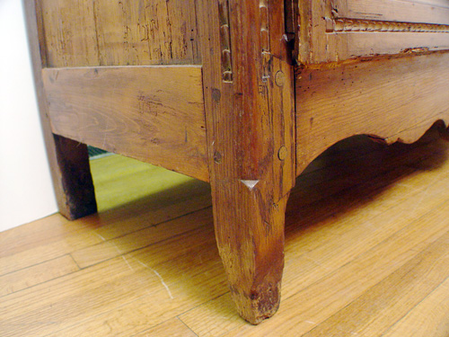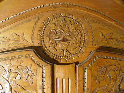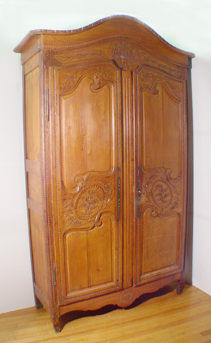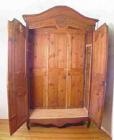 A PINE LATE 18TH C FRENCH ARMOIRE: The arched carved pediment overhangs above two doors with carved panels. Paneled sides, cabriole feet. The interior has been fitted with later shelves. 95''h. x 51'' x 20''. Est. $2500/3500**