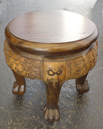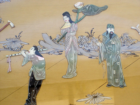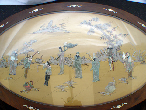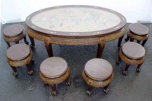 CHINESE MOTHER OF PEARL INLAY CHOW TABLE WITH 6 STOOLS: The table top has applied stone figures under a glass top, carved apron and legs. 20''h. x 50'' x 30''. The six carved stools are 13'' x 12 1/2''.