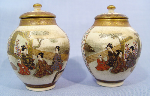 MINIATURE PAIR OF JAPANESE SATSUMA EARTHENWARE COVERED JARS: Mirror image front and back. 3 3/4''h., unsigned. Please note very small chip on underside of lids.