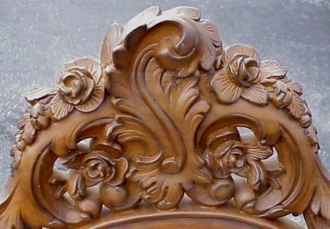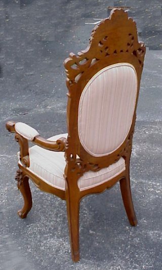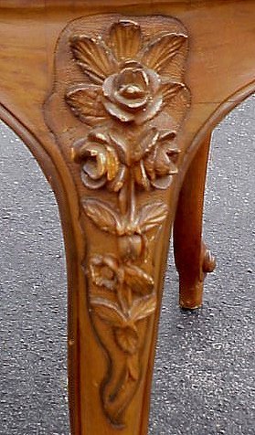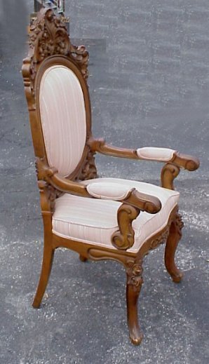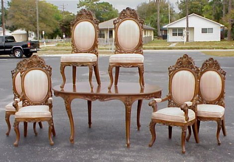 ITALIAN CARVED WALNUT DINING TABLE & 6 CHAIRS: Richly carved floral design to crest, back rest, apron, knees and arms of this gorgeous Italian suite. Comprising, table with two leaves and 6 chairs. Striped upholstered seat backs and arm rests, please note repair to chair as seen in photo. Chairs 47''h, table without leaves 66'' x 43'', leaves with carved apron 20''w. each.