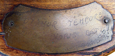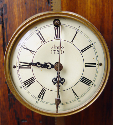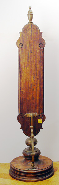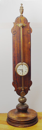 GERMAN GRAVITY CLOCK, ANNO 1750: Usually wall mounted this one has acquired a lovely custom wooden stand with dedication plaque '' UTAMUR TEMPORE QUOD NOBIS EST, 1950's reproduction of a 16th clock, not in working order, 36''h., 10'' dia base.