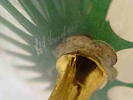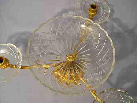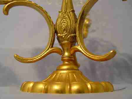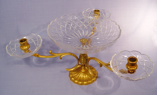 VAL ST. LAMBERT CENTERPIECE CANDELABRA: Crystal center bowl surrounded by a trio of candle holders. Gilt metal and crystal, the crystal is signed. 8 3/4'' h., 15'' dia.