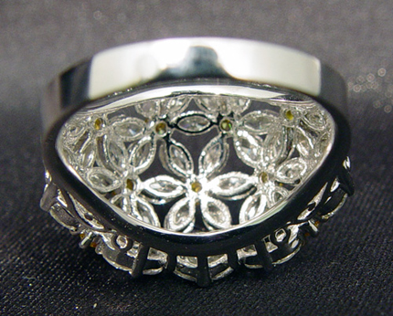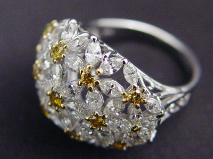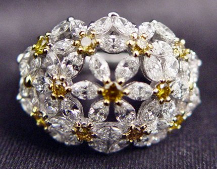 3.32ctw FANCY YELLOW & WHITE DIAMOND RING: 18k white gold ring in a floral motif prong set with possibly natural yellow and sparkling white diamonds, round and marquise cut, white stones I-J color and VS-2 clarity, size 7, 7 grams. Sold with current Tampa Gemological Laboratory appraisal, replacement price $4,900. Est. $1750/2500**