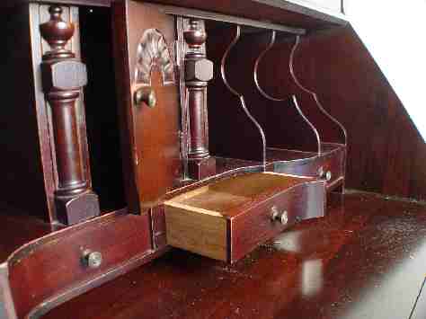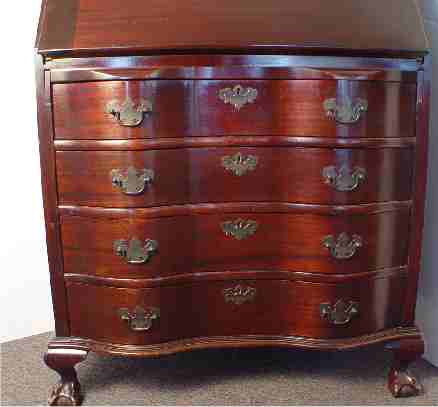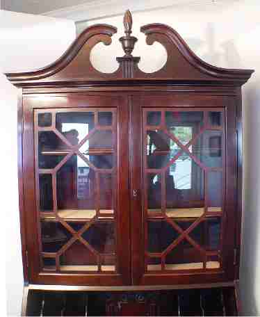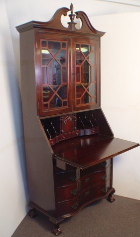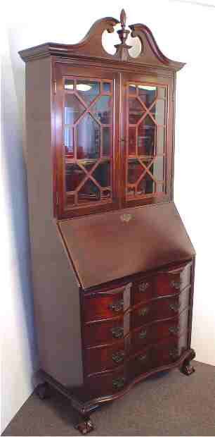 MADDOX MAHOGANY SECRETARY DESK: One piece with upper section having carved finial over glass front doors, lower slant front desk with interior cubicles and drawer over serpentine front drawers. 81'' x 32'' x 17''.