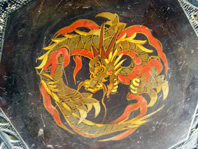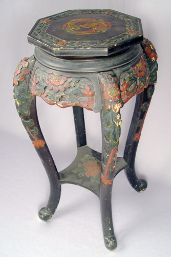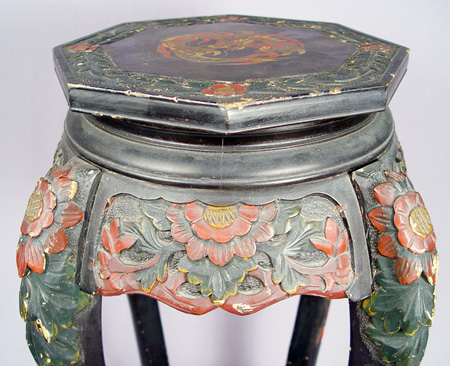 CARVED CHINESE STAND: Incised and carved with red painted highlights. The top is painted with a dragon. Some paint loss and wear. 28''h., the top is 10 1/2'' dia.