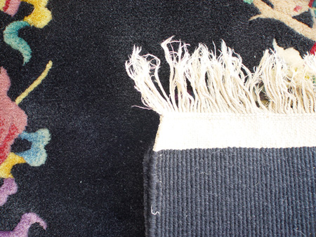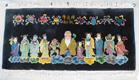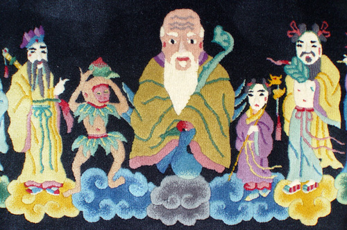 CHINESE SCULPTED PICTORIAL CARPET: Centering the image of the god of longevity, surrounded by 8 Immortals. 29'' x 58 1/2''.