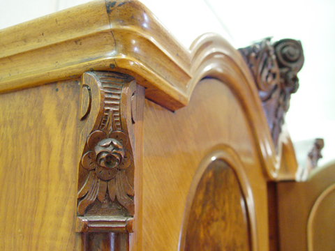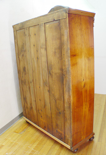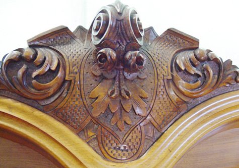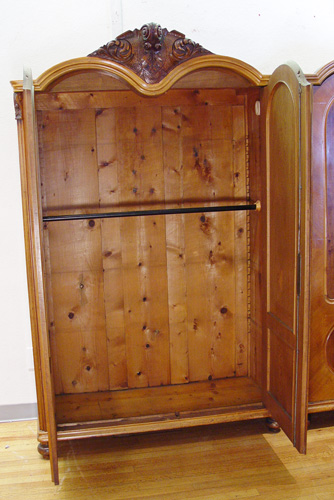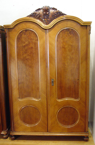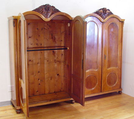 MATCHED PAIR FRENCH WALNUT ARMOIRES: Carved crest over double doors with recessed burl panels, bun feet. Interior with shelves and later added clothes bar. 80''h. x 50'' x 20''.