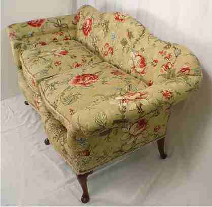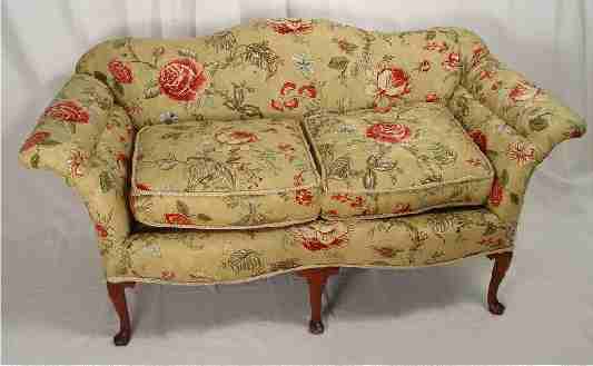 CHIPPENDALE STYLE CAMEL BACK SETTEE: With 6 legs, two cushions and rolled arms, this settee is a diminutive version of the Chippendale sofa. Early to mid 20th C. 31''h. x 60'' x 27 1/2''.