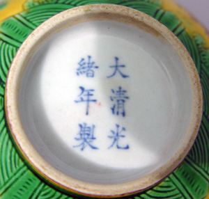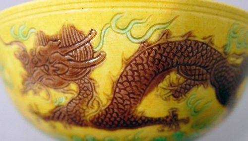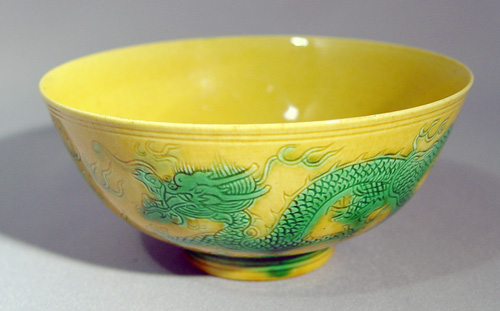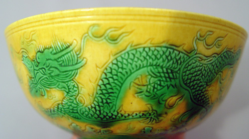 GOOD 19TH C CHINESE PROVINCIAL GUANGXU DRAGON BOWL: Green and brown on yellow, glazed interior, 5'' dia.
