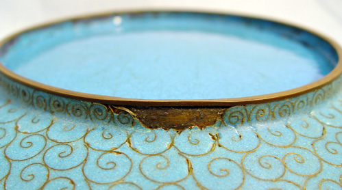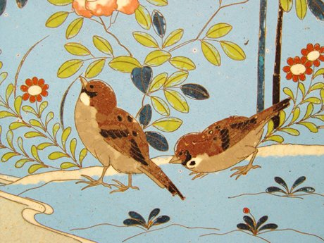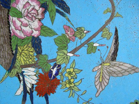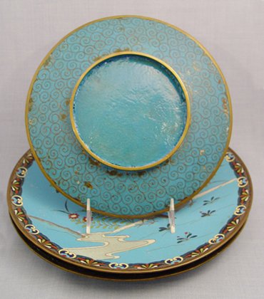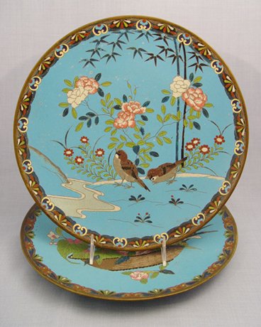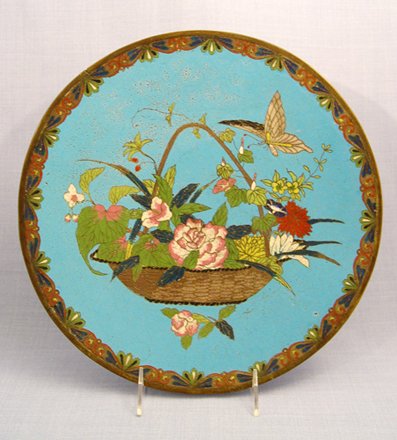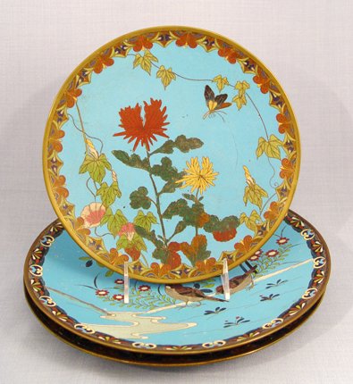 3 CLOISONNE CHARGERS: 1) Butterfly and basket, 12'' dia. 2) Birds near a stream, 12'' dia. 3) Moth and chrysanthemum, 9 1/2'' dia.