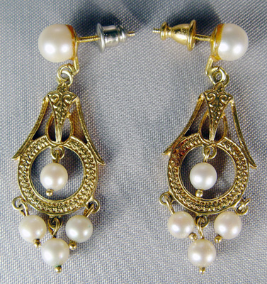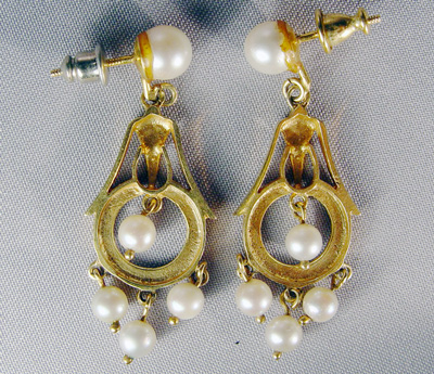 ESTATE PEARL CHANDELIER EARRINGS: Each 6.5mm pearl on post supports the yellow gold dangle earrings, acid testing at 18k and set with four more 4.5mm pearls. 1 1/2''l., 6.5 grams.