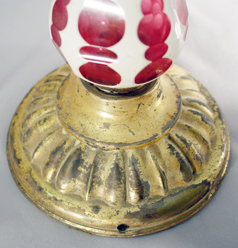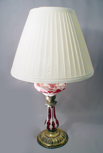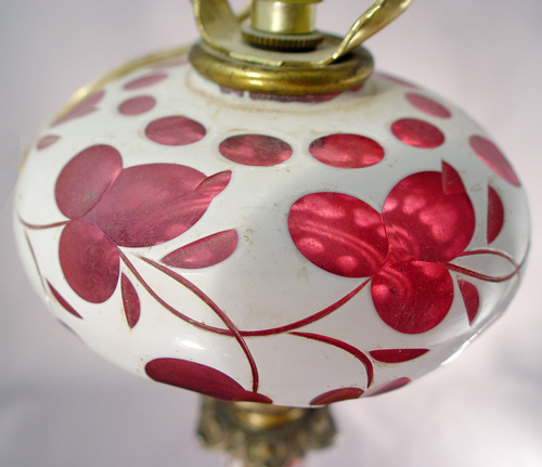 CRANBERRY GLASS LAMP: White overlay cut to cranberry. Converted to electricity, metal mounts. The glass is 12''h., the lamp is 21''h. overall.