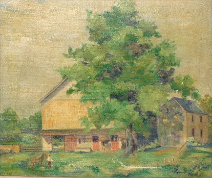 GORGAS, Rena Littell, (American, 20th C.): Rural Landscape with Farmhouse and Barn, O/C/B, 17 1/2'' x 20 1/2'', signed, in old oak frame, 21 1/2'' x 24 1/2'', signed verso and dated 1931. Needs cleaning, abrasion in lower margin.