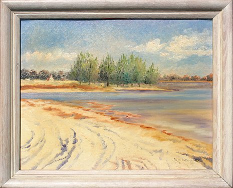 CARPENTER, Rena Littell, (American, 20th C.): ''Around the Bend From the Yacht Basin, Gulfport'', O/CB, 16'' x 20'', signed and dated 1959, signed, titled and dated verso, whitewash frame, 20'' x 24''.