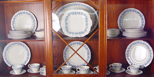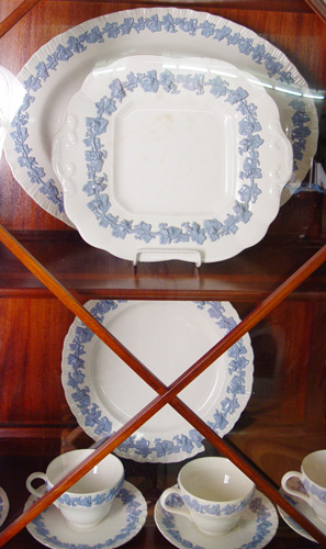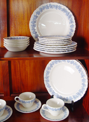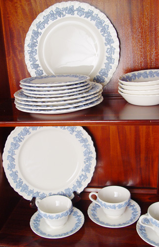 WEDGWOOD QUEENSWARE CHINA SERVICE: Blue on cream, 48 pieces to include 7 dinner plates (7'' dia), 8 salad plates, 8 bread plates, 8 dessert bowls, 8 cups, 8 saucers, and a 16'' platter.