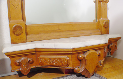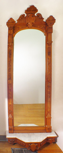 19TH C RENAISSANCE REVIVAL VICTORIAN PIER MIRROR AND CONSOLE: With burled panels and ornate crest, the frame is 75''h x 26''w. The marble top console shelf is 8'' tall x 30''w x 11'' deep.