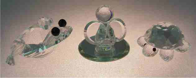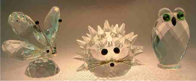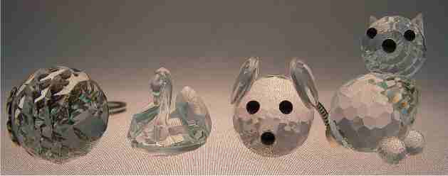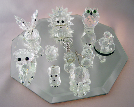 GROUP OF 9 SWAROVSKI CRYSTAL FIGURES: And a key chain. To include the 2'' butterfly, frog prince, and owl, 1 1/2'' porcupine, a turtle, 2 mice (one missing tail), and the tiniest 5/8'' swan.