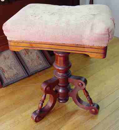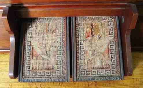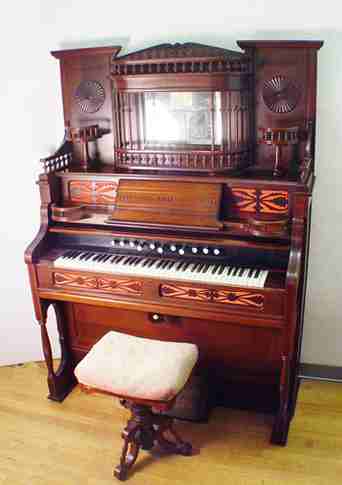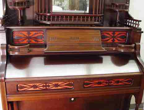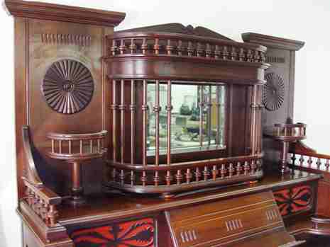 FANCY CABINET ESTEY VICTORIAN PUMP ORGAN: Spindle gallery, beveled mirror between curio shelves, candle shelves, music storage behind the easel stand. 6' tall x x 52'' x 22''. Sold with the Victorian stool.