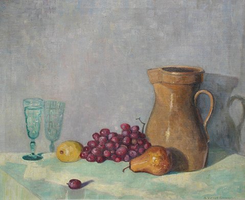 GRINNELL, George Victor, (American, 1878-1946): Floral Still Life, O/C, 20'' x 24'', signed, framed 24'' x 28'', 2 original labels verso. Paint fleck in center about quarter size.