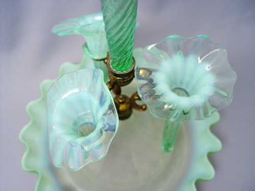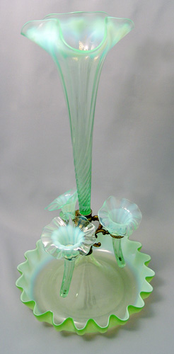 GREEN OPALESCENT ART GLASS EPERGNE: Early 20th C green opalescent epergne. Three smaller trumoets center a tall central trumpet vase. 18 3/4''h. x 9 1/2''. Free of cracks, one small chip on the ruffle bowl.