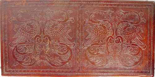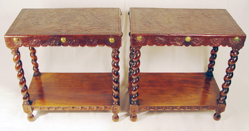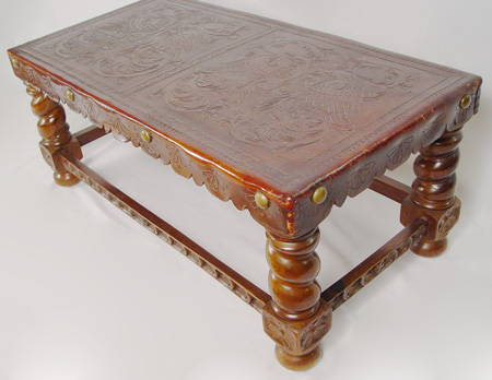 3 PERUVIAN LEATHER TOP TABLES: Matched set of two side tables and a coffee table. The legs are spiral carved, the tops are tooled leather over wood. Coffee table is 18''h. x 39'' x 20''. The side table are 24''h. x 23'' x 13 1/2''.