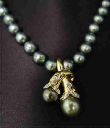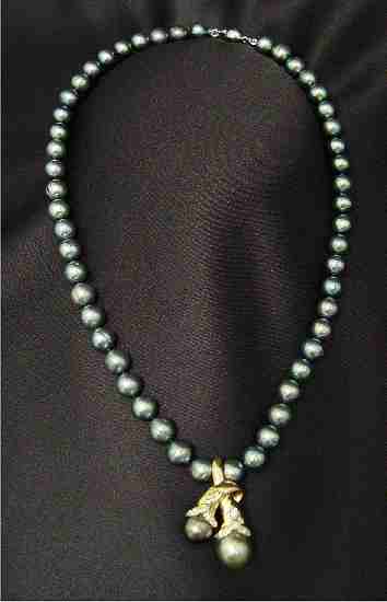 TAHITIAN SOUTH SEA NATURAL BLACK PEARL ENHANCER & 7.7MM STRAND OF PEARLS: Two piece lot consisting of an 18k yellow gold enhancer in a bypass blossom motif set with twelve tiny diamonds and two pearls - one 9.5mm in purple grey tones and one 11mm in green, approx. 1 1/4''l., 9.4 grams. Sold with an 18'' strand of 8.5-9mm pearls in teal green tones, 14K clasp. Sold as a lot. Est. $1500/2000**