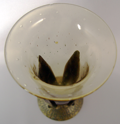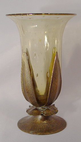 ROYCROFT VASE: Pale topaz insert of blown glass with suspended bubbles, approx. 4 3/4'', foliate motif metal base 4 1/8'', overall 5 3/4''. Please note tiny chip on lip of glass.