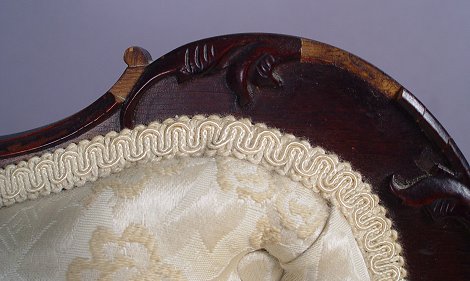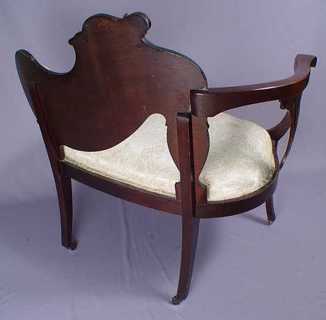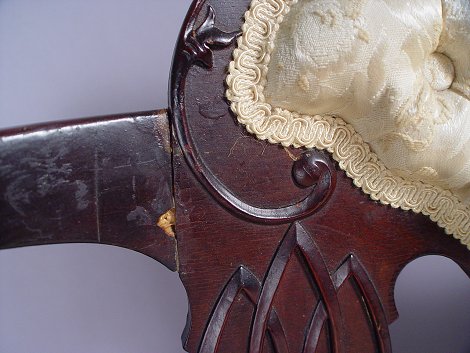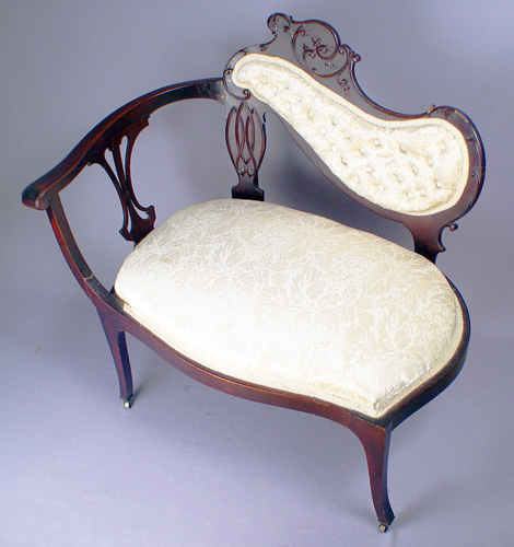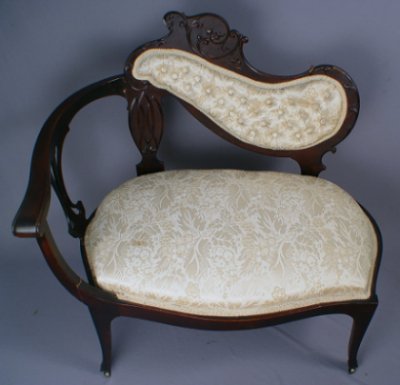 MAHOGANY FRENCH ART NOUVEAU CHAIR: One arm asymmetrical form with tufted back, original and casters. Please note loss of a small bit of the applied carving. 32''h. x 31''w. x 19''