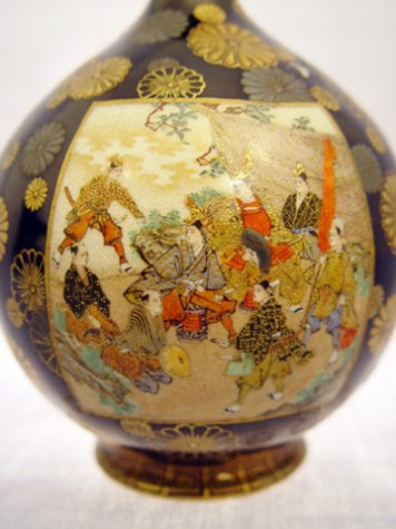 JAPANESE SATSUMA BOTTLE NECK VASE: Cobalt ground with hand intricate hand painted panels. Impressed and gilt signatures on underside. 4 1/2''h. Free of chips, cracks, or repairs.