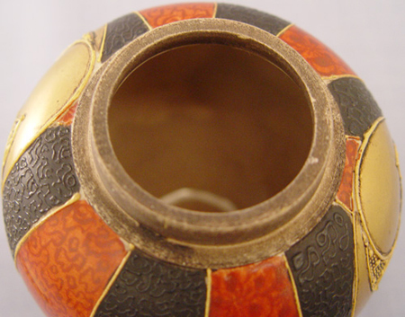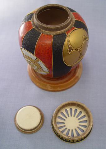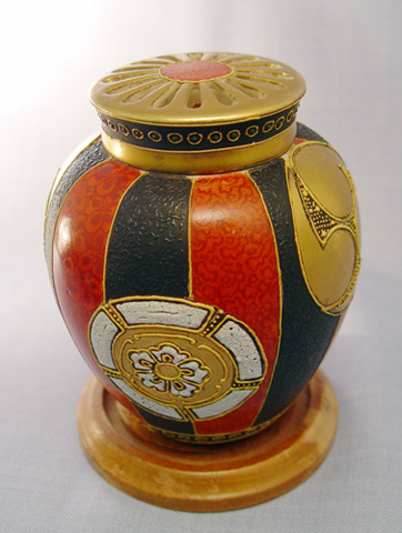 JAPANESE SATSUMA EARTHENWARE KORO: Covered jar with second vented cover for the scent to escape. Unusual black and red stripe design with gold and enameled medallions. Signed, 5''h. No chips or cracks.