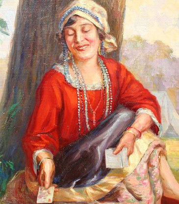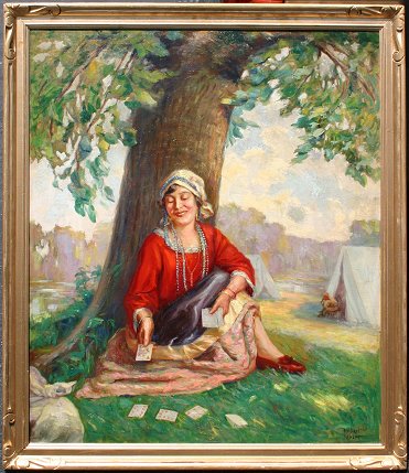 KILBERT, Robert P., (American, 1880-): Gypsy Card Player, O/C, 40'' x 34'', signed, in overpainted carved period gilt frame, 45'' x 38 1/2''. Patch verso, minimal inpaint.