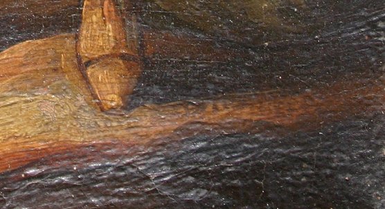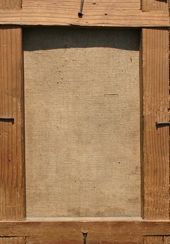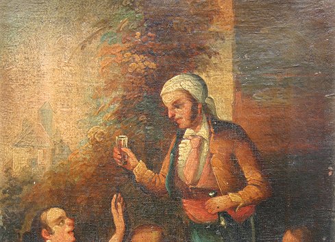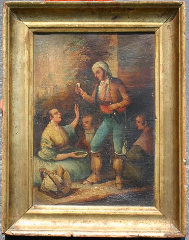 19TH C. GENRE SCENE OIL ON CANVAS: 9 1/2'' x 6 1/2'', depicts 4 figures at rest, one standing and drinking libations, gilt frame with wear, 12 1/2'' x 9 1/2'', possible signature lower right. Needs cleaning and some work, sold as is.
