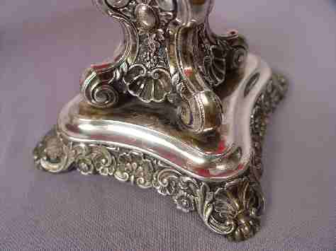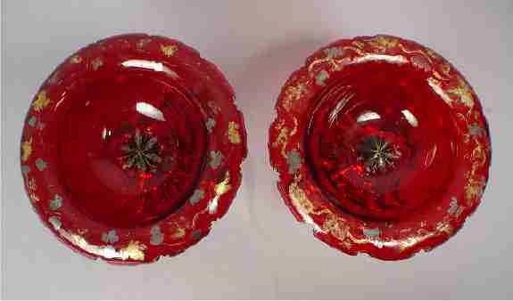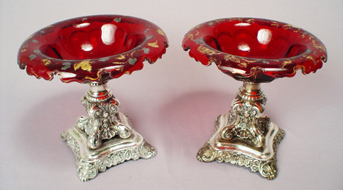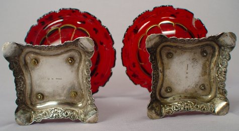 19TH C GERMAN SILVER COMPOTE STANDS: Clearly signed Lameyer, somewhat legible stamp for Hanover, Germany. The ruby glass is of Moser quality with heavy wear to gold and silver overlay, one is chipped. The silver is in overall good condition. Monogrammed CK. 7 1/4''h, 7 1/2'' dia.