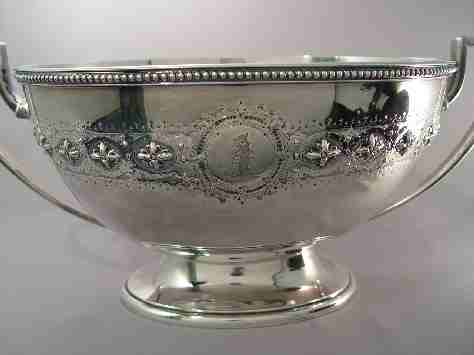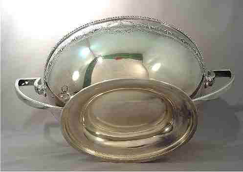 19th C SILVERPLATE TUREEN: Oval in shape with repousse frieze, beaded border and dramatic handles. The cover has a beaded loop finial handle and bright cut decor. The manufacturers hallmarks have been polished off through time, the interior has a substantial loss of silver, exterior is beautiful. 10 1/2''h. x 16 1/4''. x 9 1/4''