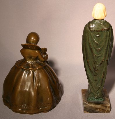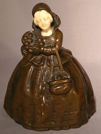 LUGERTH, Ferdinand, (Austrian, 1885-1915): Figure of a Knight, Cold Painted Bronze with Ivory, 6''h., signed, impressed foundry mark, sold with a Bronze and Ivory Figural bell of a young girl, unsigned, 4'' h. Knight has wear to paint, reattached head, maiden has stress cracks in ivory.