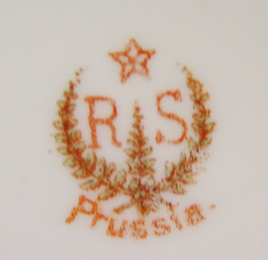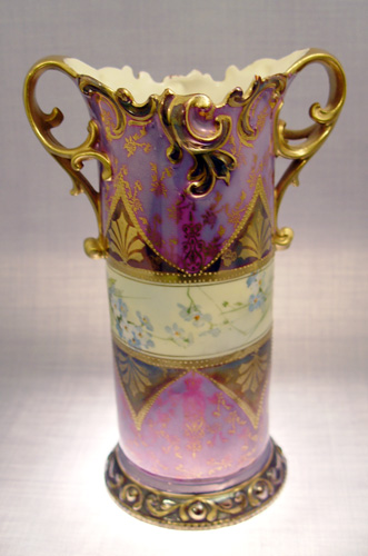 RS PRUSSIA PORTRAIT VASE: Double handles vase with lavender iridescent finish, red wreath mark. 9 1/2''h x 6''w x 4''d.