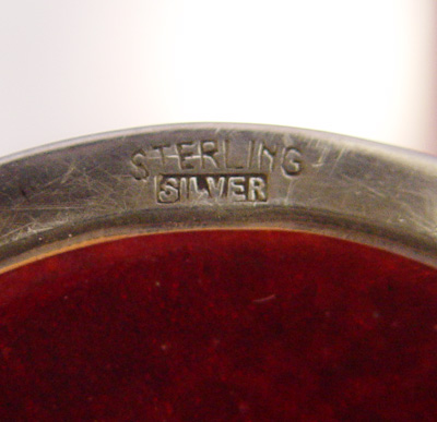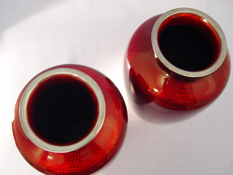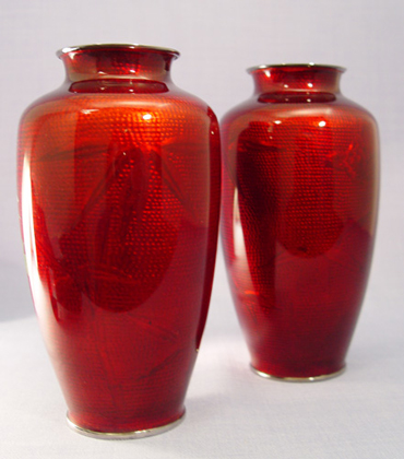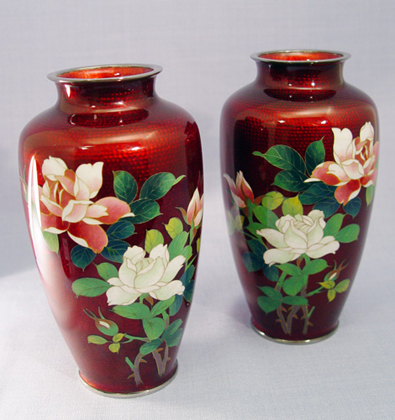 JAPANESE AKASUKE PIGEON BLOOD CLOISONNE ON STERLING: Japanese floral design on front, traditional bamboo verso, stamped sterling, 7''h.