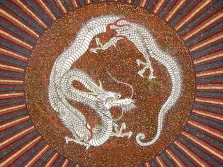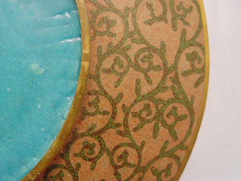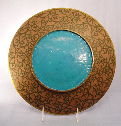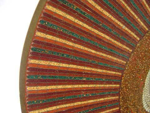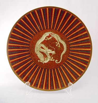GOLDSTONE CLOISONNE ENAMEL DRAGON CHARGER: Unusual striped design centering a white dragon, 12'' dia.