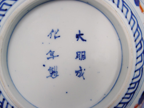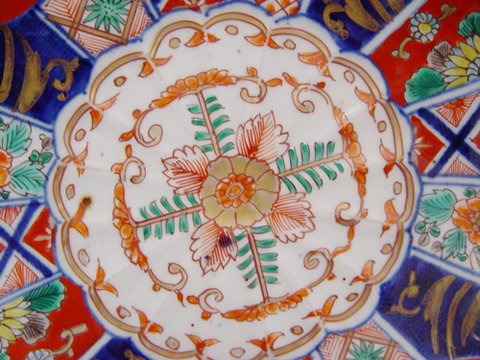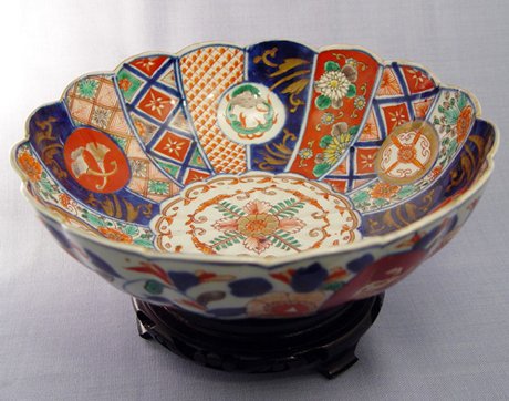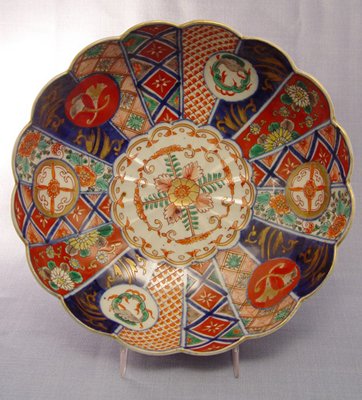JAPANESE IMARI BOWL: Cobalt, iron red, green and cobalt. Scalloped edge, signed in characters on the underside. 9 3/4'' dia.