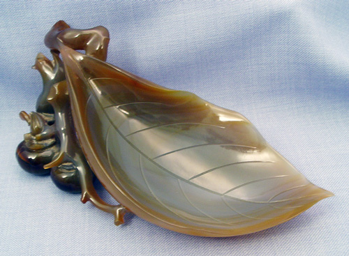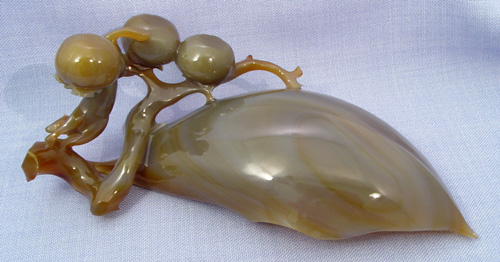 CHINESE CARVED JADE LEAF: Smooth as glass, with squirrel and berries at the stem. 2 3/4''h. x 8''l.
