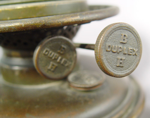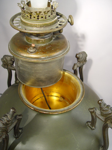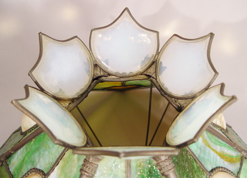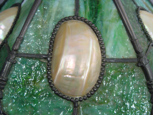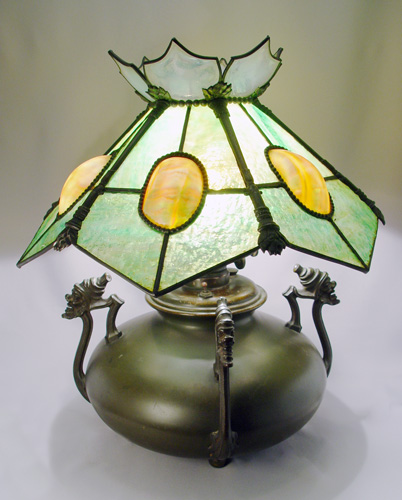 UNUSUAL BRADLEY & HUBBARD LAMP: Slag glass and mother of pearl shade over a bronzed base featuring gnomes. Electrified oil lamp signed on the thumbwheel. 19'' h. x 14''.