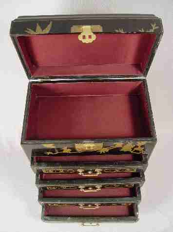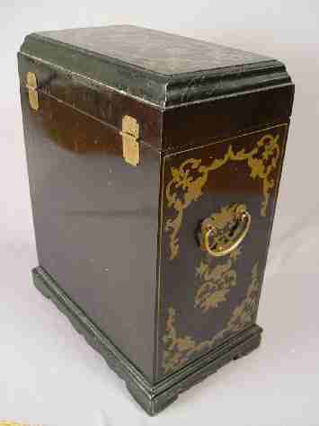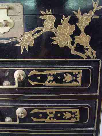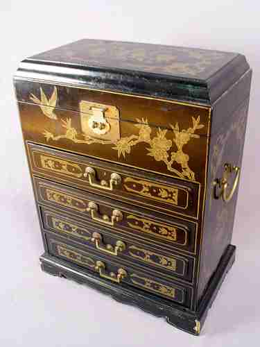 CHINOISERIE DECORATED MINIATURE CHEST: Lift top over 4 drawers. 20'' x 15'' x 9''.