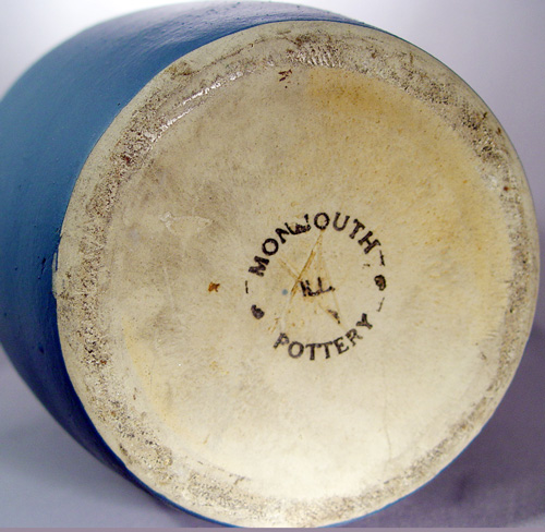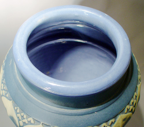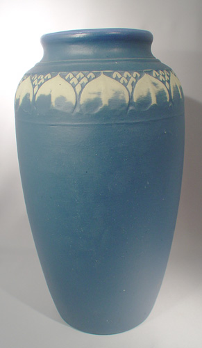 ARTS & CRAFTS MONMOUTH POTTERY VASE: 16'' tall blue matte glaze vase with high gloss interior. Arts & Crafts frieze along the shoulder.