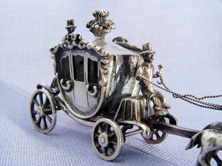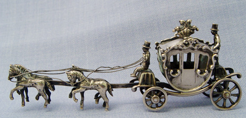MINIATURE DUTCH SILVER HORSES AND CARRIAGE: Four horses pull the carriage with driver and coachman. The wheels turn. 2''h. x 4 3/4''l. Hallmarked with the Dutch sword and standards 825. Approx. 2.25 oz., 70 grams.