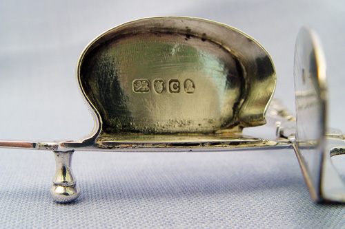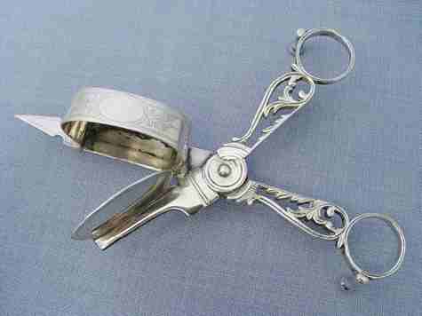 EARLY 19TH C ENGLISH STERLING CANDLE SNUFFER: London, 1818. Scissor form with pierced design on the handles. Clear hallmarks, may have a repair to underside. 6 1/2''l.