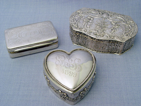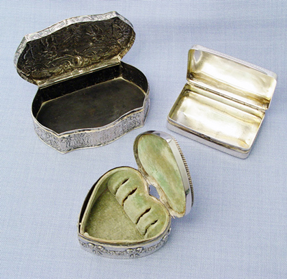 GROUP OF 3 STERLING BOXES: 1) Heart shaped jewelry box dated 1899, with velvet lining and slots for rings. Beading outlines the heart, ribbon and floral swag around the bottom. Hinged top, inscribed RB. Hallmark for Mauser of New York. 1 1/4''h. x 2 1/2''. 2) Gorham hinged top box, 3/4''h. x 3'' x 2''. 3) A heavily embossed box with hinged top, illegible hallmarks probably Dutch, 1 1/8'' x 4'' x 2 3/4''. 9.16 oz. or 285 grams total.