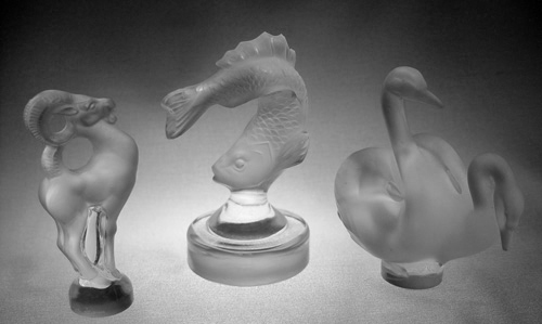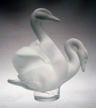 3 LALIQUE FRENCH CRYSTAL ANIMALS: All 3 are frosted, all are signed. 1) Fish, 3 3/4''h. (small flake) 2) Antelope, 3 1/4''h. 3) Two Swans, 3 1/4''h.