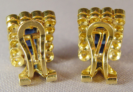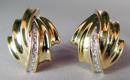 ESTATE GOLD AND DIAMOND EARRINGS: Yellow gold earrings of 14k in a crossing wave design, one per clip is encrusted with 8 tiny diamonds, clip post backs, marked 14k, 12 grams.
